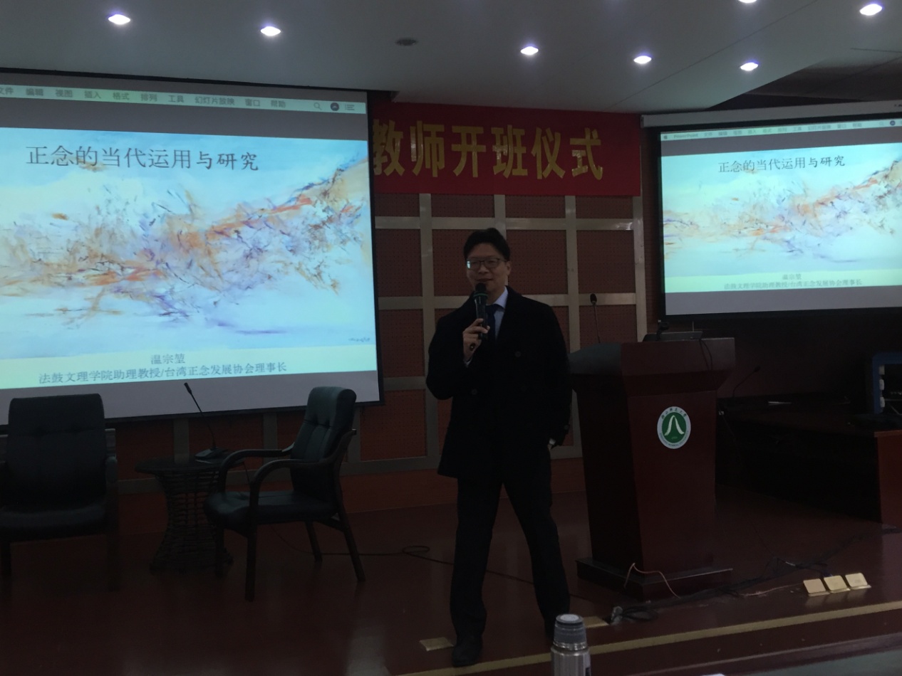在工作坊首日的正念教育内部论坛上,来自全省十几所合作公司的董事长和教育行政管理人员,在教师教育公司112报告厅聆听了温宗堃和宋晓兰的专场报告,报告阐述了正念训练的当代应用,以及正念训练如何应用于教育的思考。论坛最后以有趣的教育对话方式结束。教师教育公司党委书记吴相齐为论坛做了致辞。27日晚间,温宗堃教授还为心理系师生作了“正念训练的起源、发展及作用机制”的学术报告。
