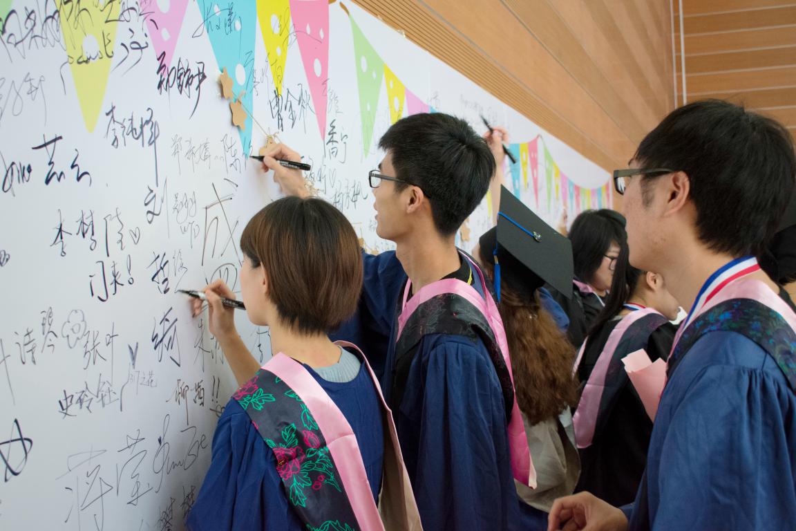 留下我姓名,寄托我情思。在签名板上签名留念,系上寄语卡片,毕业生们的一笔一划都满载感激和自豪。