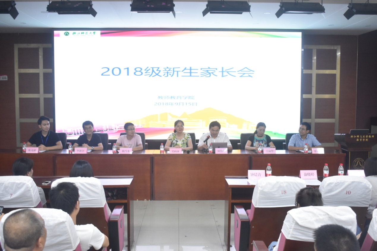 紧张有序的新生报到结束后,15日下午,公司2018级新生家长会于17幢112报告厅举行。教师教育公司党委书记吴向齐、党委副书记狄伟锋、学工办主任杨雪龙、教育学系主任王丽华、应用心理学系主任李新宇、教育技术学系主任张家华、2018级辅导员张文潇、各新生班主任及新生家长出席了本次会议。