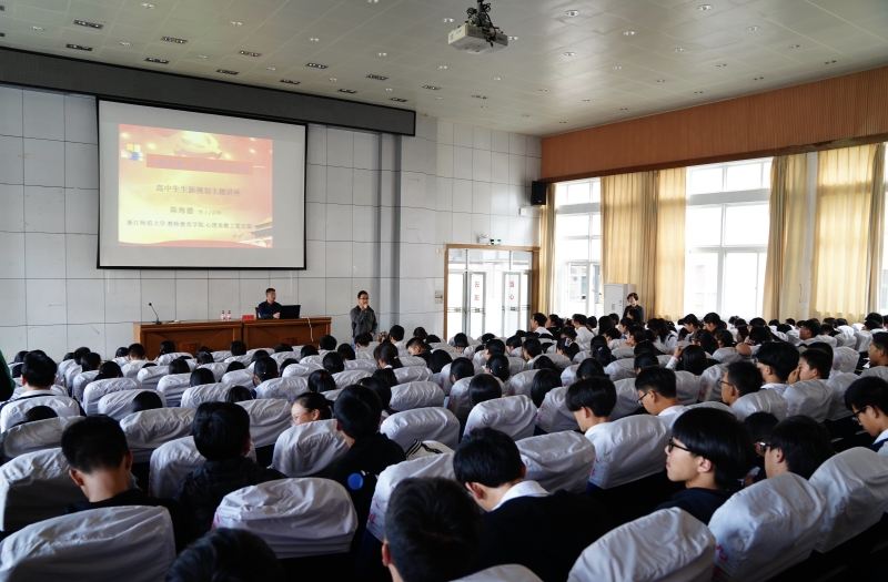 陈海德博士以“猜人名”的游戏开始讲座,与现场同学积极互动,气氛活跃。再从生涯发展的轨迹、自我发展的愿望以及浙江省高考改革的背景三个方面指出了高中生生涯规划的重要性,并通过贴近生活的案例,进一步启示长远的人生目标和明确的规划路线的重要意义。最后,陈海德博士从高一员工目前面临的选考问题为切入点,详细讲解了高中生生涯规划要做的具体准备。