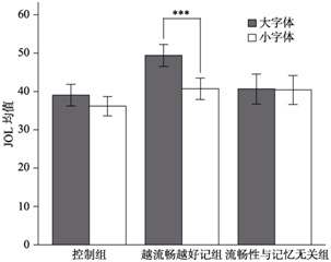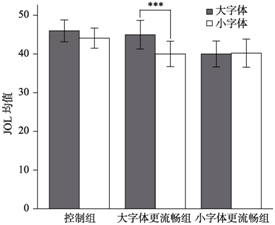 图3 实验2字体大小和组别的交互作用(图中误差线为标准误, ***表示p< 0.001。)