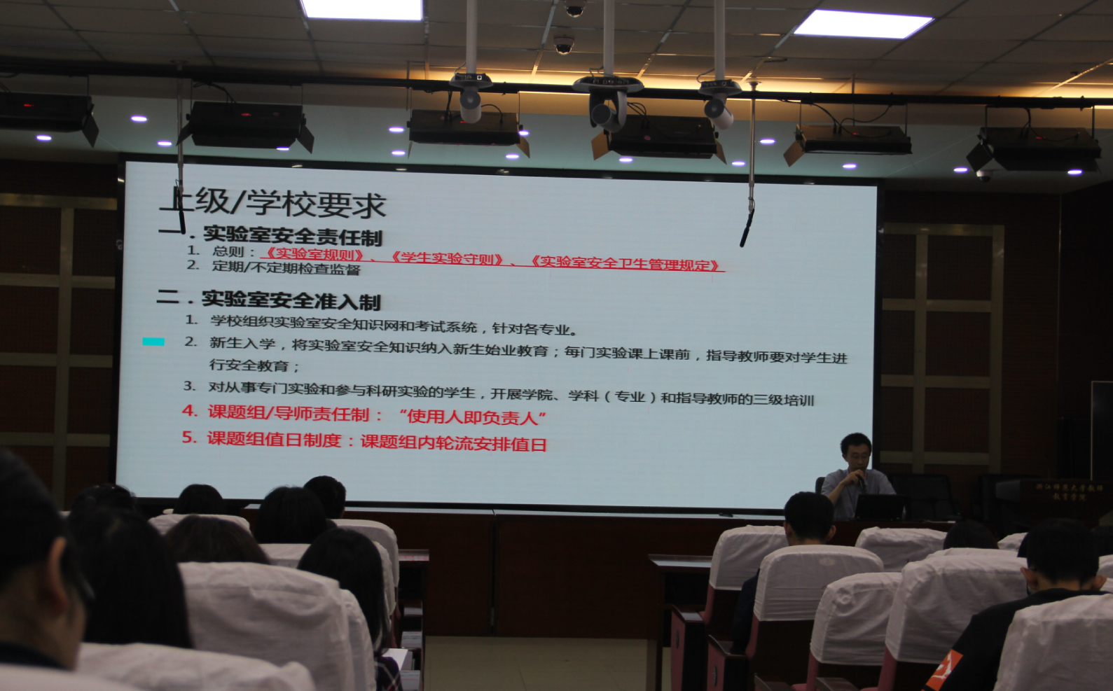 为落实公司关于实验室安全工作的文件要求,进一步加强教师和员工的实验室安全意识,我系于5月7日晚在17幢112报告厅举行心理学实验室安全教育讲座活动。会议由心理系主任李新宇老师主持,杨越老师做介绍,心理系部分教师和全体研究生参加了活动。