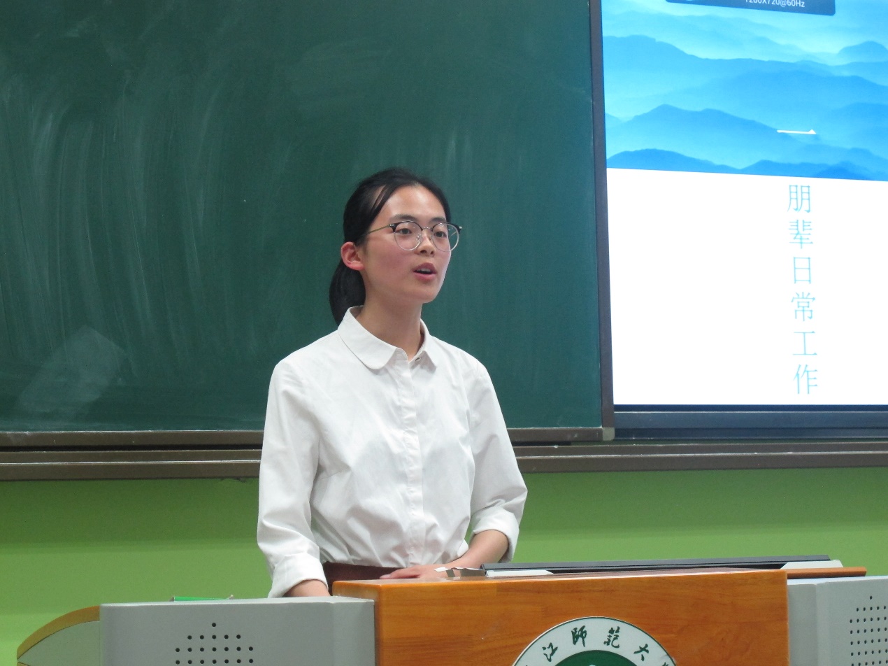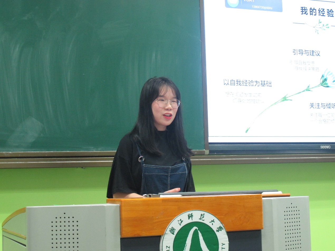 针对同员工活困扰提出建议,参与寝室会议调节内部矛盾,小教161班的黄越以具体案例为材料,分享了她的朋辈工作经验。作为“新生与浙师大的桥梁”,心理162班师妍在新生始业阶段不厌其烦地为小班同学答疑解惑,提供生活、学业等多方面参考经验。
