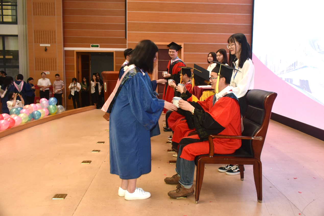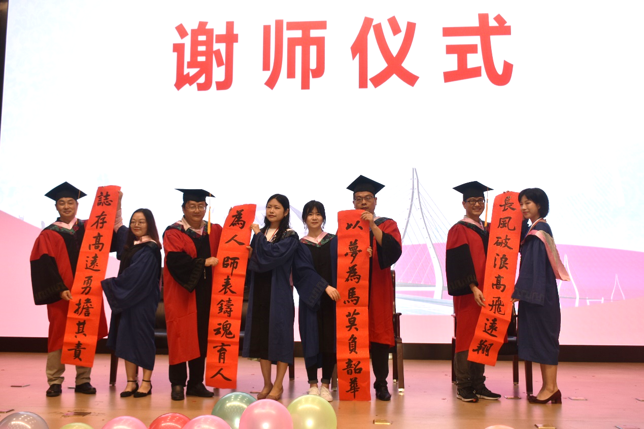 四年成长,何以忘却师生情。本科毕业生的班主任上台向自己的员工送去最后的谆谆教导,回首四年、寄语未来。与此同时,硕士毕业生代表进行了谢师仪式,鞠躬、敬茶,向自己的导师献上最真挚的感恩。导师则郑重回以手书寄语——“砥砺前行、开拓创新”,“镇魂育人、莫负韶华”等期望与祝福在纸墨上一览无余。