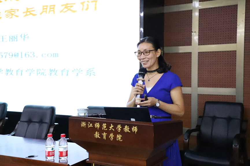在专业介绍环节,教育学系主任王丽华、心理学系主任李新宇和教育技术学系主任张家华老师分别从发展历程、团队情况、就业方向、培养方案等角度详细阐述了各专业特色及发展优势。随后,新生家长代表就高中与大学的多方面差异,结合自己的教师经历,表示家长将积极配合老师培养孩子独立学习、生活的能力。