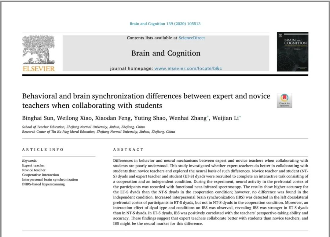 Sun, B., Xiao, W., Feng, X., Shao, Y., Zhang, W*., & Li, W*. (2020). Behavioral and brain synchronization differences between expert and novice teachers when collaborating with students. Brain and Cognition, 139, 105513.