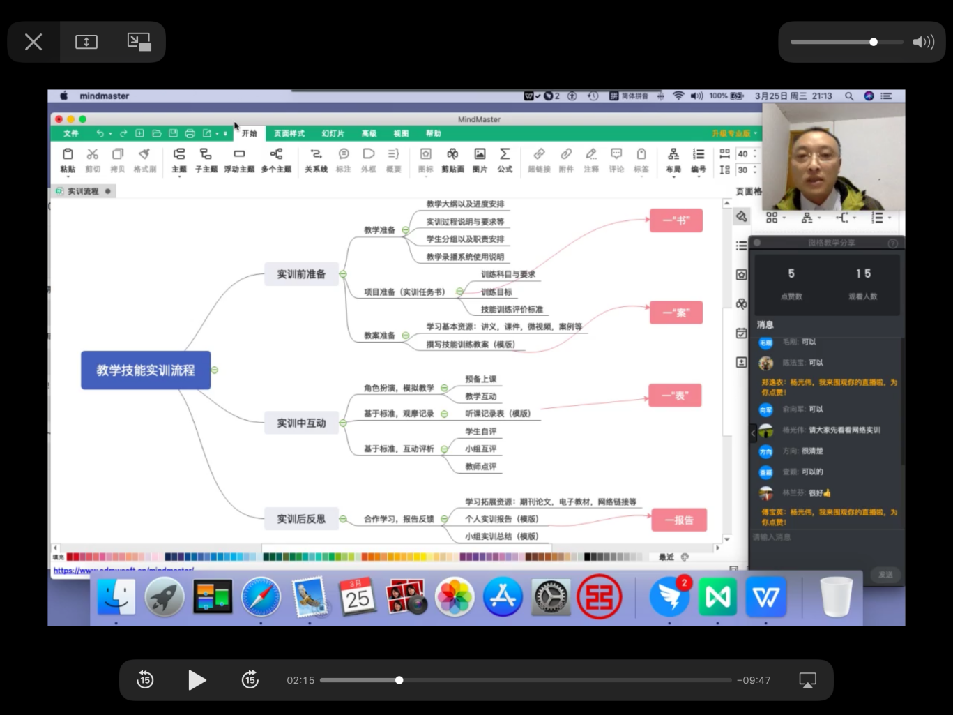 接下来的三位老师向大家分享了微格教学实践的线上教学情况。考虑到学科评估、专业评估、专业认证等方面的需要,教育技术学专业的李鸣华老师发挥技术优势,把微格教学建立在实训平台上,设置小任务让同学们完成,并要求同学间互评,以达到对微格训练的学习和反思作用,同时在钉钉课程群里进行同学汇报和老师讲评。李老师还为17级的同学安排了线上见习听课,使同学们的见习顺利开展。
