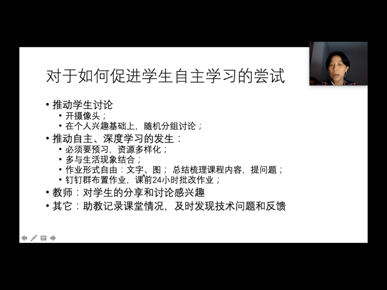 线上课程尤其是实践类课程的开展是对师生的共同挑战,需要老师们各展所长,系统建设,严格要求。同时也是机遇,加快推进了混合式课程建设的速度,通过分享交流,老师们对线上教学和实践课程线上开展有了进一步的讨论和思考,为自身的教学提供了借鉴。