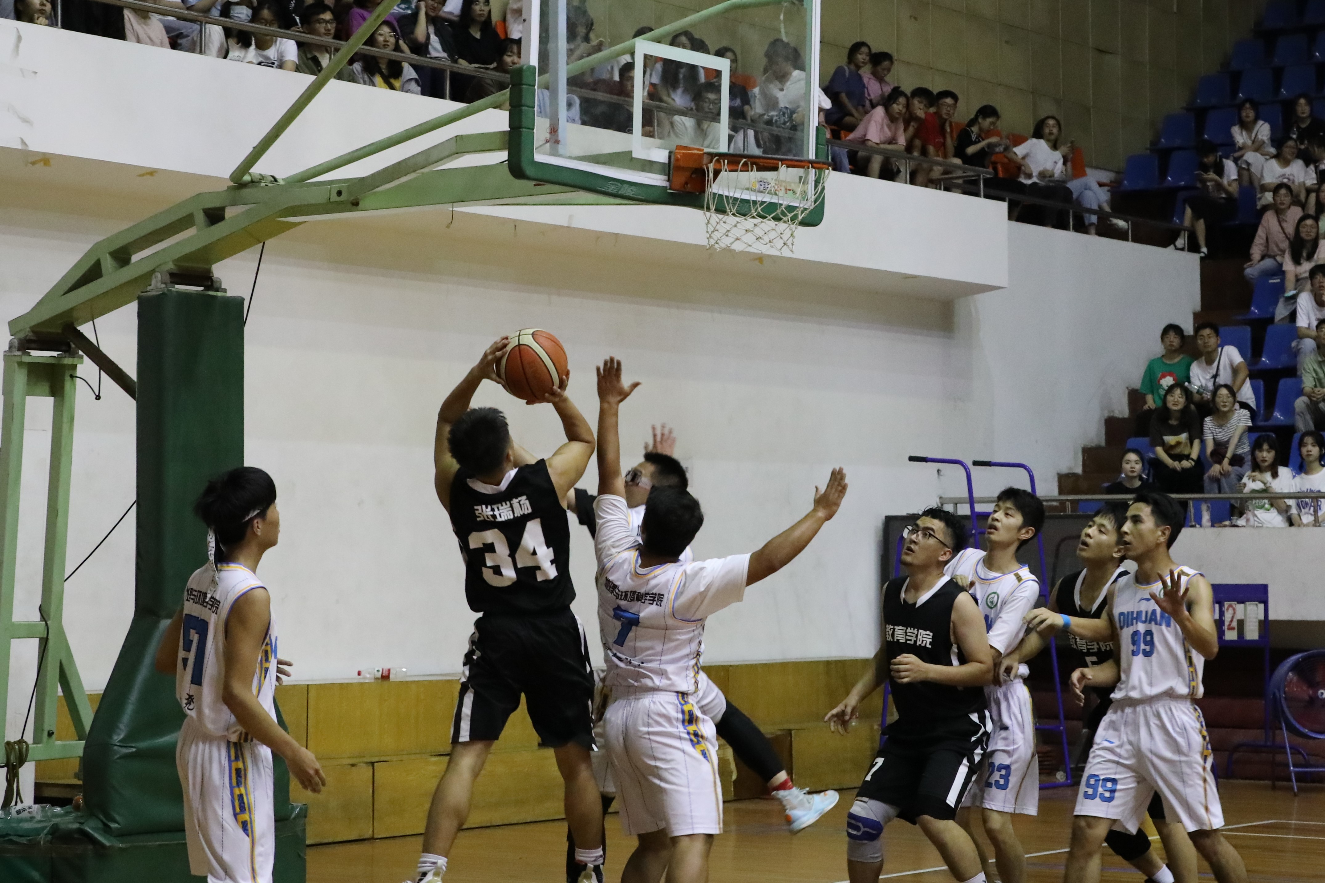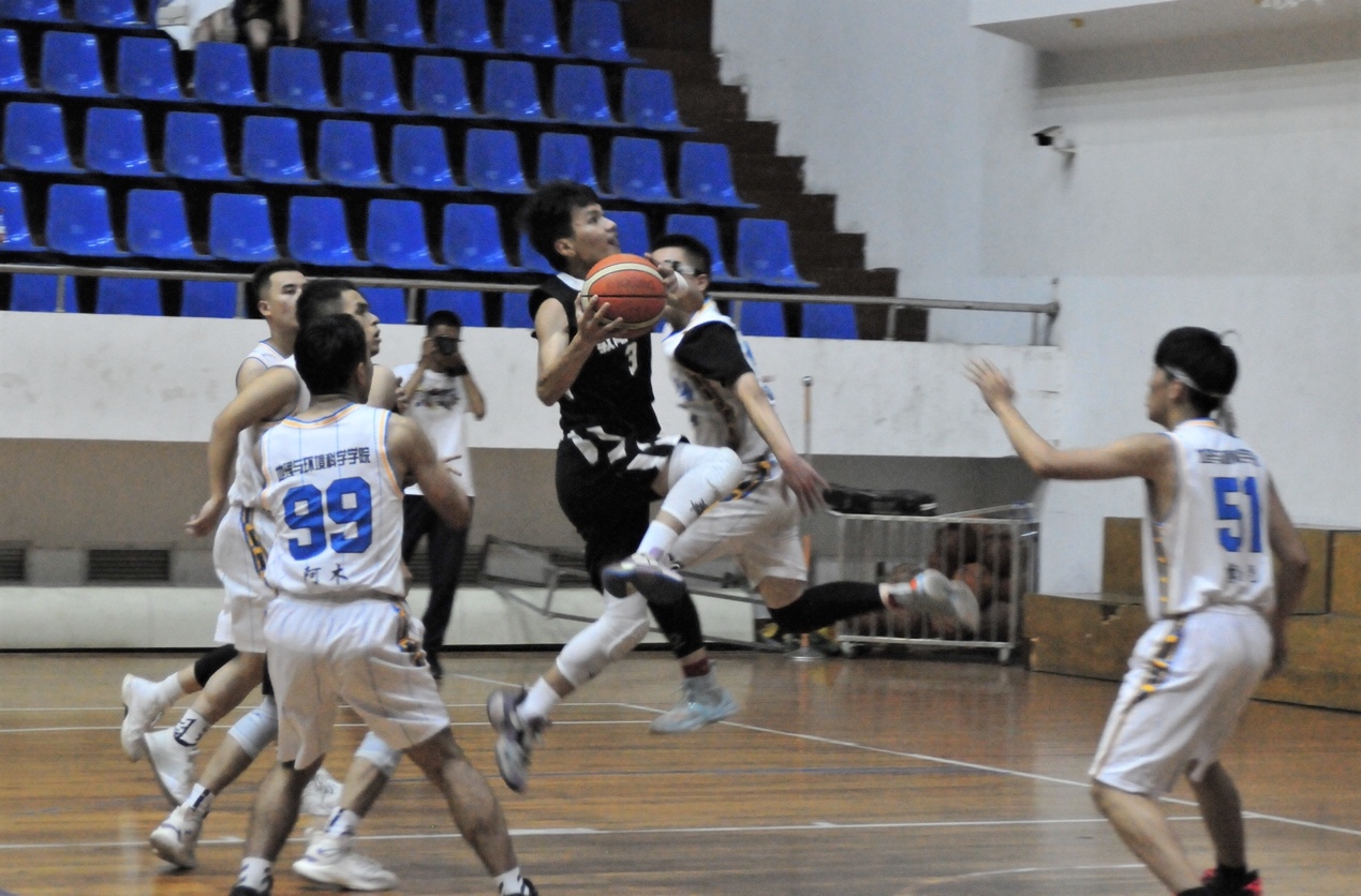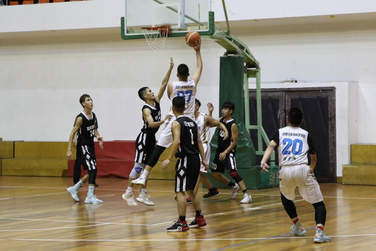 随着裁判一声哨响,比赛双方展开了激烈的对决,众多教院学子也纷纷到至现场,为公司的运动健将们加油打气,呐喊助威。公司篮球健将们在球场上努力拼搏、配合默契,24号艾沙抢断快攻动作迅速;3号张金鑫面对对手强硬防守突破上篮投进三分,取得教育公司校男子篮球赛决赛首分;8号包立松串联全场,多次抢断以及送出助攻……教院球员们的一个个精彩表现博得观众阵阵喝彩。在欢呼声中,队员们乘胜追击,依靠防守与快攻,半场就建立了较大优势。