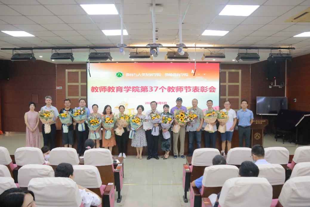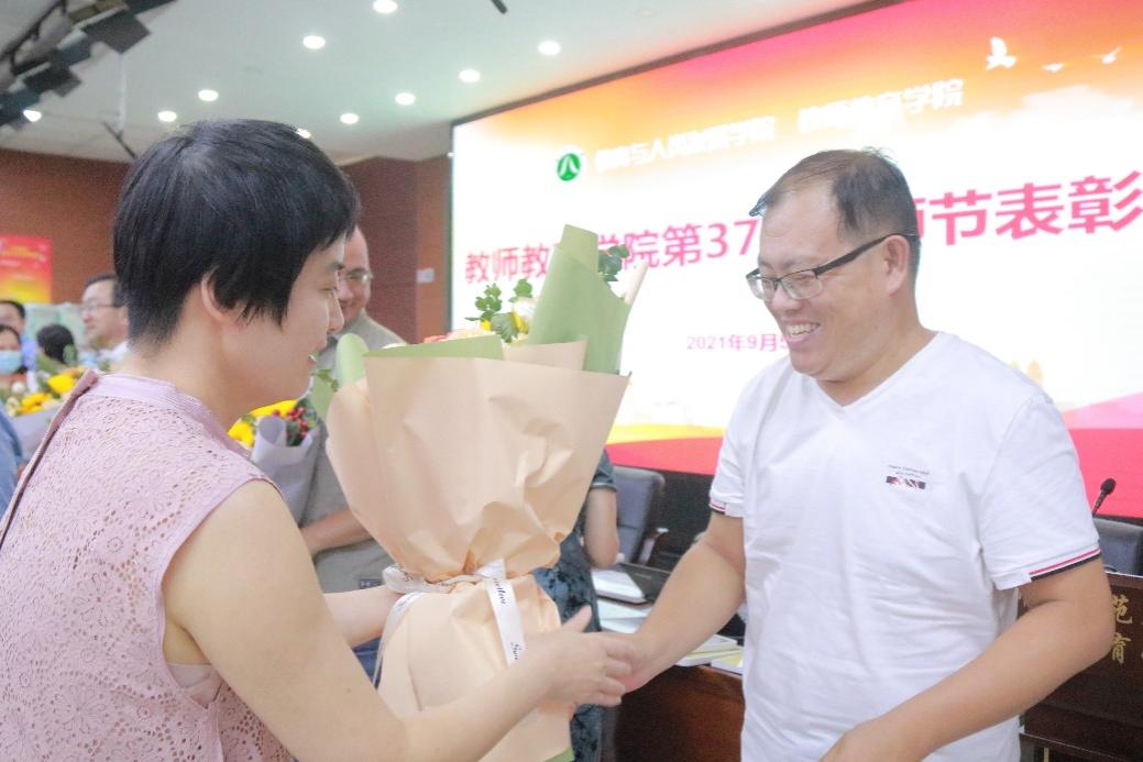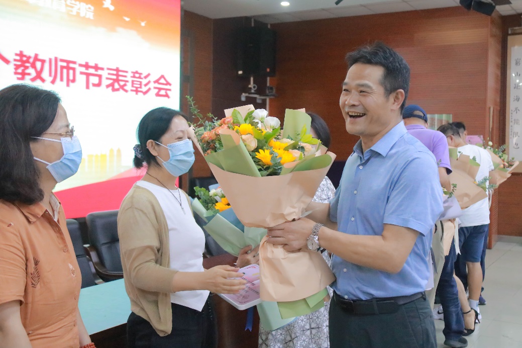 黄良英老师对全体荣誉获得者及其奖项名称依次进行汇报,周跃良经理和查颖书记为获奖者颁发奖状、献上鲜花。最后向全院教工送上了教师节祝福和礼物。