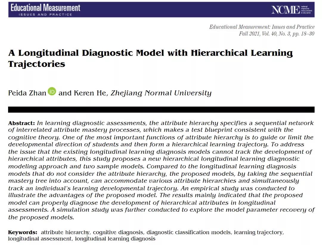 近日,XC体育心理学系詹沛达副教授及合作者在NCME(美国教育测量委员会)会刊Educational Measurement: Issues and Practice (SSCI,IF: 1.702)发表题为A Longitudinal Diagnostic Model with Hierarchical Learning Trajectories的文章。该研究部分内容受到教育部人文社科青年基金项目(No. 19YJC190025)和国家自然科学青年基金项目(No. 31900795)的资助。