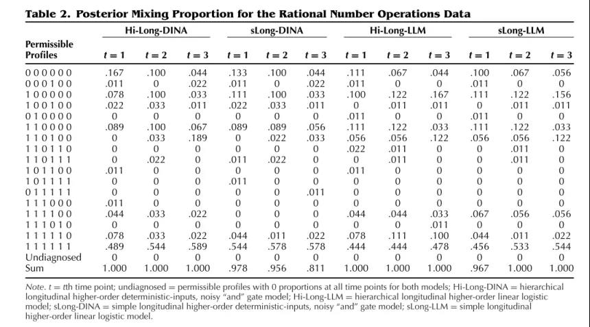 表2 四个模型的后验混合比例(即具有各属性模式的人数占比).