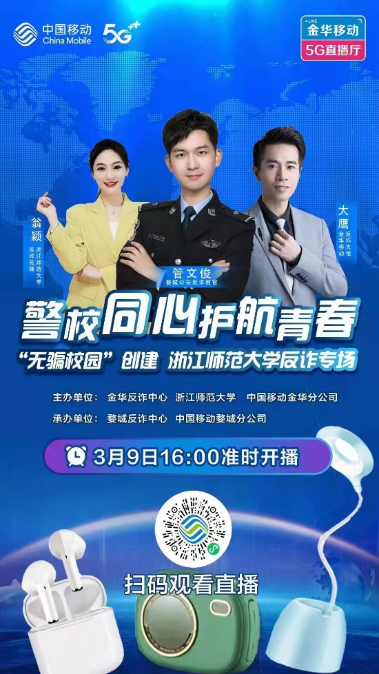 在诈骗活动日益猖獗的当下,反诈宣传不容懈怠。3月9日,为帮助同学们更好地了解和掌握反诈知识,增强自我保护意识,金华反诈中心联合公司举办了“警校同心 护航青春 创建平安浙师”网络直播活动,邀请同学们参与观看学习。