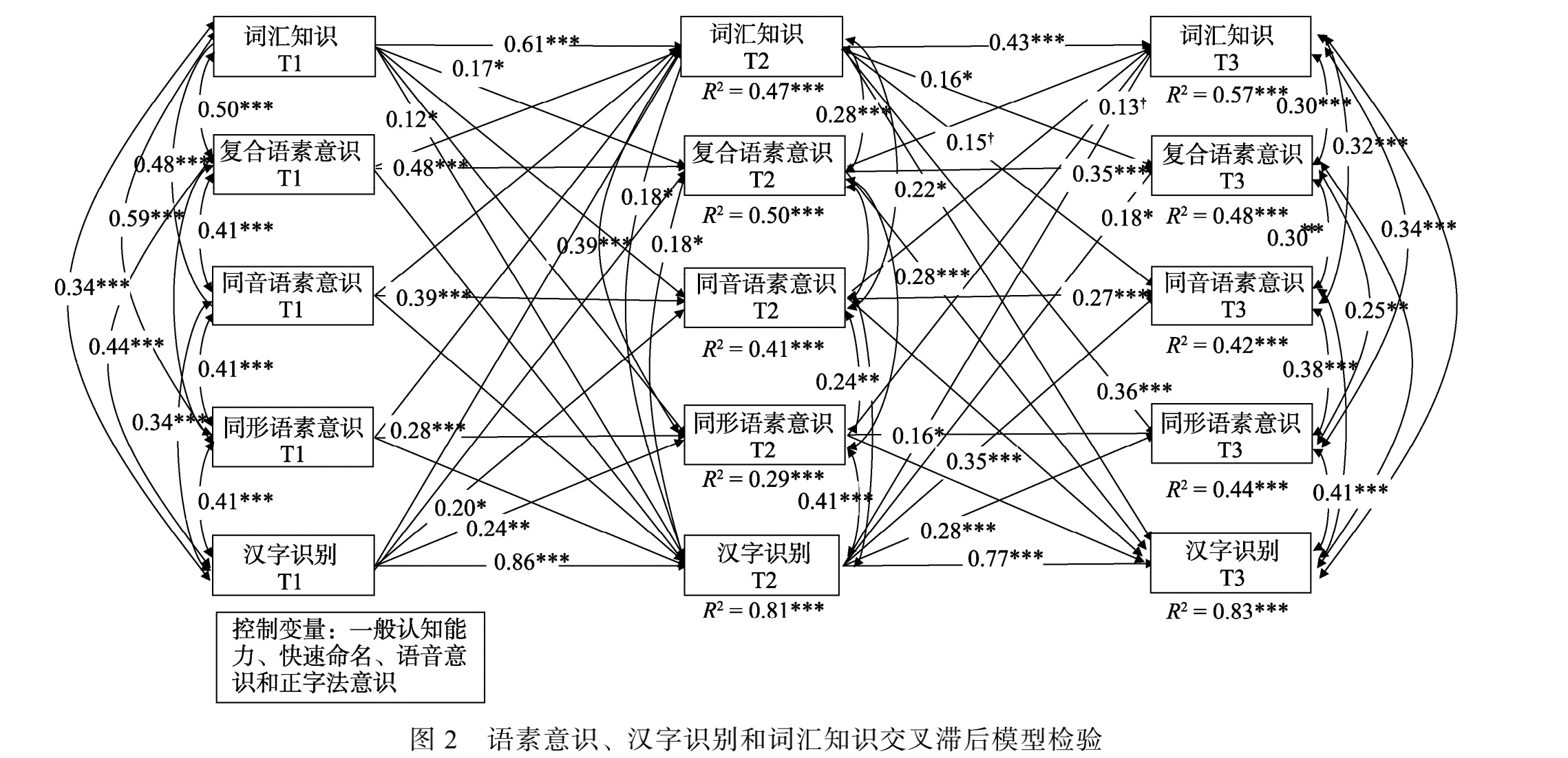 儿童语言文字的学习是一个复杂的过程,其中语素意识、汉字识别和词汇知识在这一发展过程中都具有重要的作用和意义,这三者之间发展关系的变化也是汉语研究者关注的热点的又是一个复杂的心理加工过程,需要多种认知加工能力的协同运作才能顺利完成。一方面,语言发展过程中汉语儿童在认知上会形成各种元语言意识,其中语素意识是元语言意识的重要组成成分。语素意识是指个体对语言最小意义单元的感知和操作,通过将词语拆分,并对其成分进行分析来构建整词的意义。行为和计算建模的证据表明,由于汉语语言及书写系统的特殊性,汉语中的音节、字符和语素之间存在着一一对应关系,一个语素一般表示一个汉字,这使得汉语对语义处理的要求比英语等拼音文字更高。基于此,语素意识在汉语中发挥着更重要的作用,尤其是在字词学习中。另一方面,汉字识别和词汇知识在汉语儿童语言发展过程中也是至关重要的。进入小学的儿童开始接触书面文本,逐渐对字符的形态结构有了深入的理解和认识,从而掌握更多更复杂的汉字和词汇。此外,在英语儿童和汉语儿童的研究中均已发现字词之间存在紧密联系。综上,同时探索语素意识、汉字识别和词汇知识在小学儿童语言发展过程中的相互关系具有十分重要的意义。
