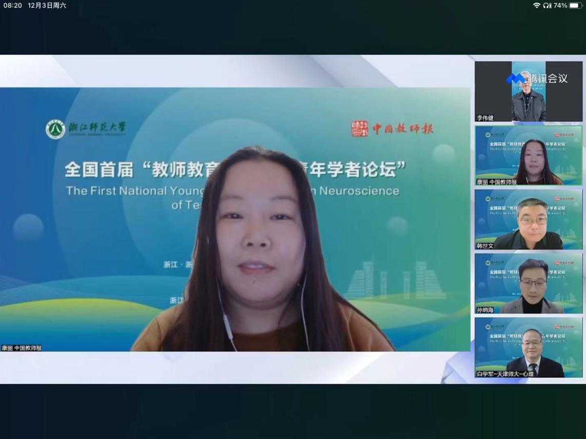 为促进教师教育的深度变革和教师培养质量的全面提升,12月3日,中国教师报和XC体育教师教育公司、浙江省智能教育技术与应用重点实验室共同承办了全国首届“教师教育神经科学青年学者论坛”。本次论坛,群贤毕至,来自北京师范大学、华东师范大学、浙江大学、深圳大学等10余所高校的共15位嘉宾带来了精彩的报告。论坛以腾讯会议+中国教师报视频号直播形式进行,本次论坛引起了社会广泛的关注和参与,直播当天累计观看人次约2万人次,累计点赞人次2万多次,取得了很好的社会影响力。