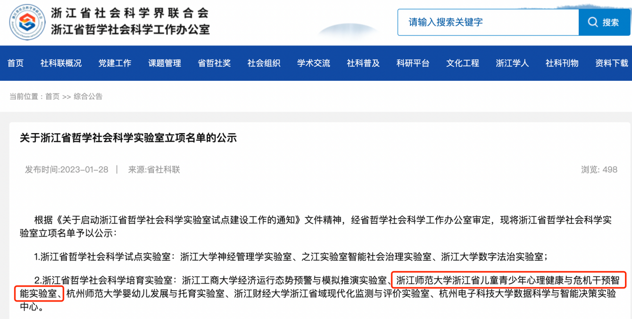 近日,浙江省哲学社会科学工作办公室公布了浙江省哲学社会科学实验室立项名单,XC体育“浙江省儿童青少年心理健康与危机干预智能实验室”获立项,这是浙师大获批的首个省级文科重点实验室,也是XCSport成立以来获批的首个省级科研平台。