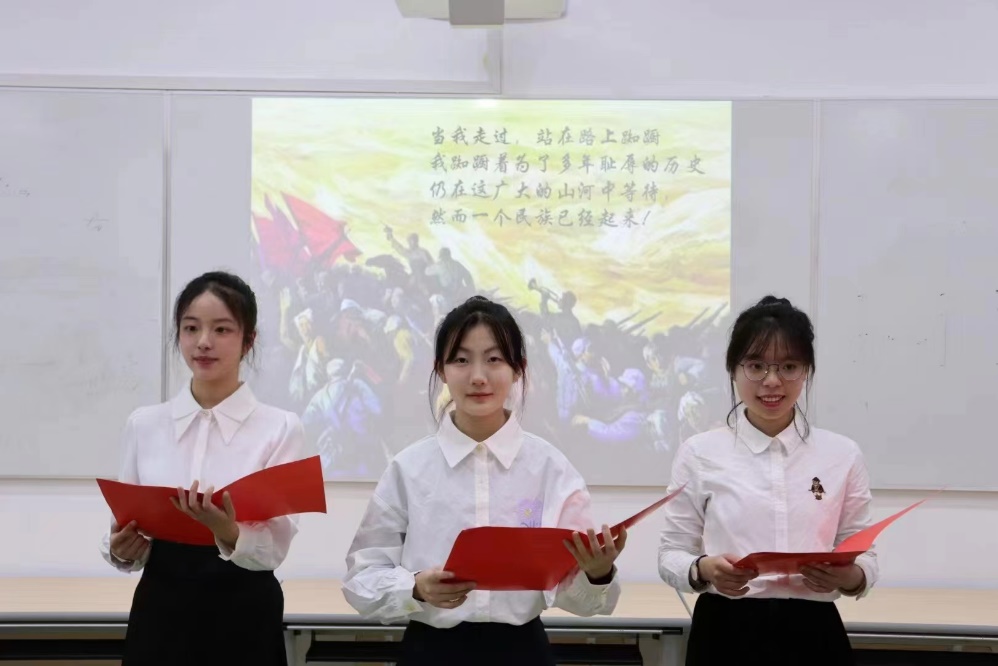 姜茹月、王维苑、黄瑞瑜三位同学带来了《赞美(节选)》,三种不同的声线,碰撞出别样的火花。“一个民族已经起来”,是当时人们殷切期盼,却是今朝真实的写照。既反对逃避现实的唯艺术论,也反对扼杀艺术的唯功利论——意图在理性和艺术间求得恰当的平衡,他们用自己的血肉情感抒发了对民族存亡和人类命运的感性认识。
