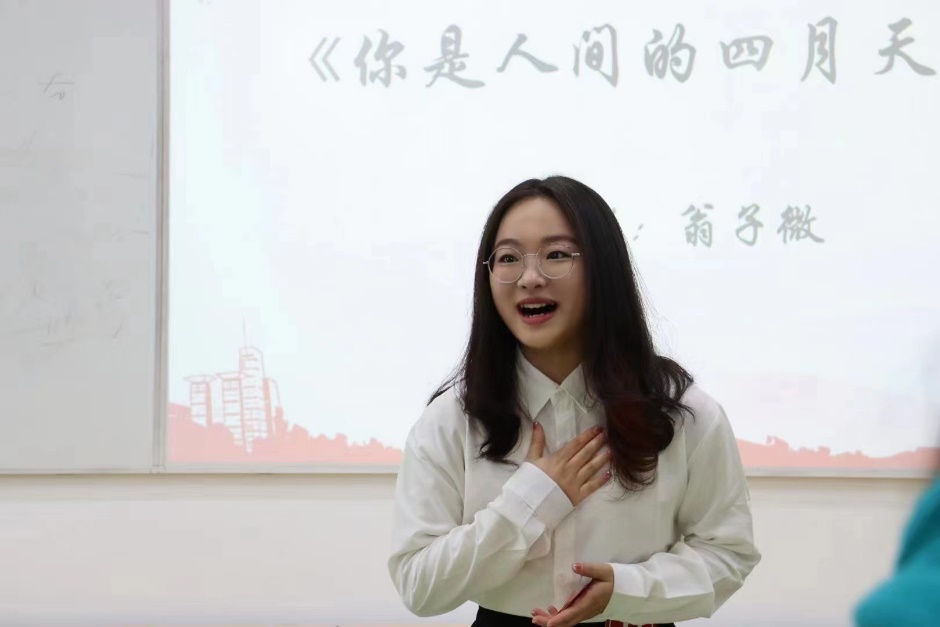 翁子微同学带来一首《你是我的人间四月天》。别样的断句,恰如其分的节奏,给这首诗注入了独特的情感。“是爱,是暖,是希望,你是人间的四月天”,去歌颂爱,歌颂希望,歌颂人间的每一缕确幸!