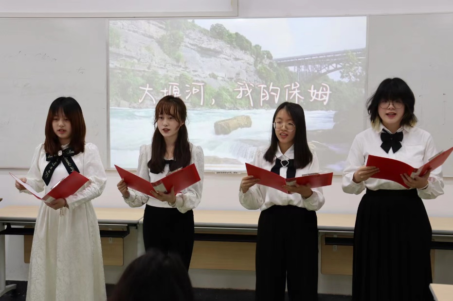姜茹月、王维苑、黄瑞瑜三位同学带来了《赞美(节选)》,三种不同的声线,碰撞出别样的火花。“一个民族已经起来”,是当时人们殷切期盼,却是今朝真实的写照。既反对逃避现实的唯艺术论,也反对扼杀艺术的唯功利论——意图在理性和艺术间求得恰当的平衡,他们用自己的血肉情感抒发了对民族存亡和人类命运的感性认识。