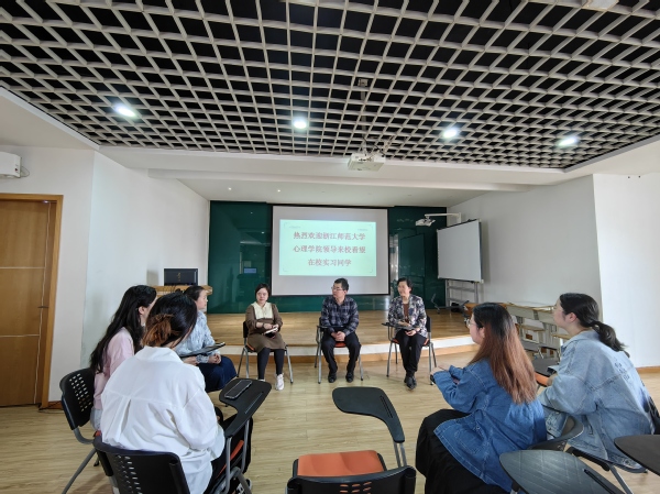 贾磊副经理鼓励实习生,实习实践是一个发现问题和解决问题的过程,心理健康工作开展要建立在专业自信的基础上,同学们要用发展的眼光看待自己,不负性反刍过分否定,积极去分析方法和行动改进。房娟老师建议同学们在正式上课之前要积极磨课,向实习公司优秀的老师学习,多听课多请教,处理问题从事件细节出发。同时希望实习公司指导老师对员工上课多给予指导反馈,在心理咨询结束后对实习生的情绪及时疏导。