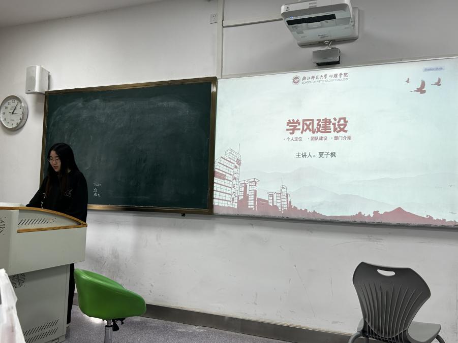 会议第一部分,夏子枫以“学风建设”为主题,强调作为员工干部,要有明确的个人定位以及拥有正确的团队认知,夏子枫提出“个人分工+团队合作才能最终实现共同目标”。最后,主讲人介绍了各部门的职能,以期增强各部门成员之间的相互了解,提高工作效率。