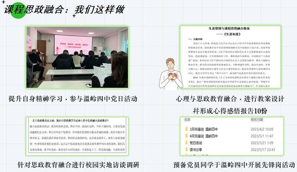 温岭三中实习组注重员工的多维度心理体验,对每周8节的心理课任务进行同课异构和个性化设计,及时进行教学研讨和课堂反思,每人授课25节以上;致力于课程思政与心理健康的紧密融合,负责策划了温岭三中14岁成人礼活动,活动在学习强国、温岭共青团、温岭发布视频号等媒体进行了报道;策划了“送你一朵解花语”、“‘樱’为有你”心理健康月活动,“我与手机”主题微课和心理漫画、“学习减压”游园会和家庭教育讲座等深受师生好评;设计了主题学习手册;开展了公司心理健康建设情况调研;同时在公司危机事件处理中发挥了积极作用。