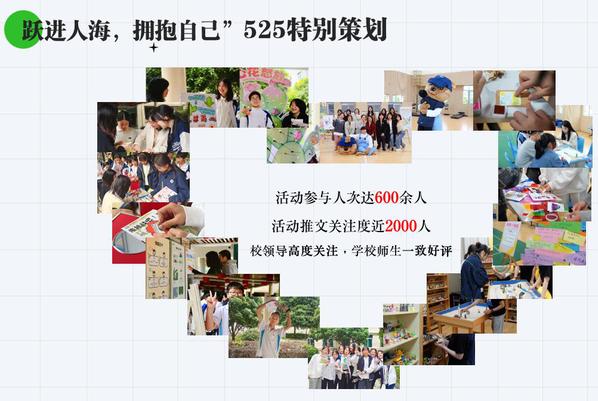 温岭第四中学的同学们在实习期间通过发布主题-修订成稿-听课教研精心打磨教案,完成了7个主题30份6万余字的原创教案设计;实习组一共听课105节,班级授课64节,完成心理社团授课8节,在指导老师的带领下进行教研活动40余场;中午接待员工开展心理咨询,共接待了咨询访谈 61 次;晚上进行备课和心理活动策划;开展员工考前心理调查、员工心理健康调研和公司心理健康建设满意度调研;在10周期间先后开展了以“夜空中最亮的星”为主题的的生涯规划活动、以“跃进人海,拥抱自己”为主题的525特别策划活动和温岭市亲子心理研学活动,活动参与人次达600余人,推文关注度近2000人。实习组各项工作赢得了公司师生一致好评。