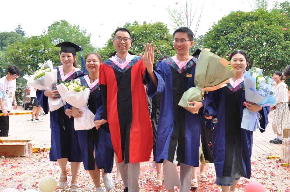 迎朝阳,走花路。典礼开始前,毕业生在导师、班主任的带领下、在广大同学的欢乐与祝福中,昂首走上心理红毯,接受礼炮的洗礼,冲过五彩的气泡墙,并在大门口的展板边签字合影。炮声隆隆,庆贺走下四年时光;彩带飞舞,指向无尽未来