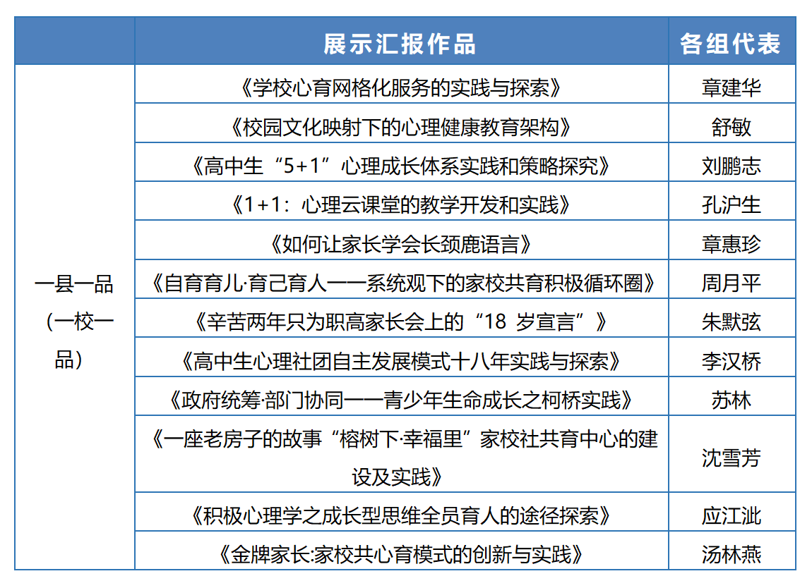在结业仪式前,进行了两部分的汇报。首先是各小组学员代表进行一县一品(一校一品)个人汇报(如下表)。学员结合自己的心理教育主张,在专家的指导下不断打磨形成所在地的品牌方案。其次是进行家庭教育系列微课成果展示。李伟健和孙炳海充分肯定学员的展示,并提出了期望。随后,李伟健与俞国兴董事长为各位优秀学员颁发证书。