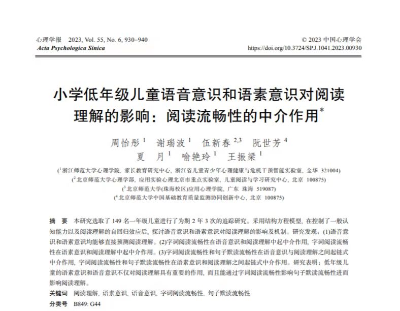 论文2来源:周怡彤, 谢瑞波*, 伍新春, 阮世芳, 夏月, 王振梁. (2023). 小学低年级儿童语音意识和语素意识对阅读理解的影响: 阅读流畅性的中介作用. 心理学报, 55(6), 930-940.