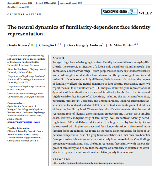 论文来源:Kovács, G.,Li, C., Ambrus, G. G., & Burton, A. M. The neural dynamics of familiarity-dependent face identity representation. Psychophysiology.