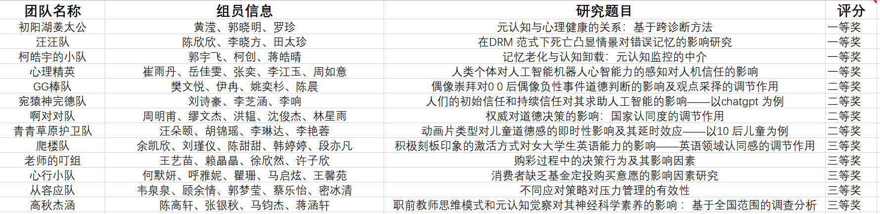 根据《关于举办2023年首届全国老员工心理与行为在线实验精英赛的第二轮通知》文件的相关要求,截止到8月19日20:00,共收到参赛作品13项。经个人申报,专家评审,最终评出一等奖4项,二等奖4项,三等奖5项。具体名单公示如下: