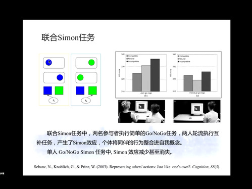 在第三部分,汪俊教授详细介绍了社会互动与联合行为以及相关的研究范式。联合行为就是个体努力协调与他人的行为。针对联合行为在当前研究中的主要问题,汪俊教授进行了详细介绍,并指出在实验室环境下,可以采用对单人和社会互动情景中个体的差异来解决。此外,汪俊教授详细介绍了联合行为的研究范式——联合Simon任务,以及联合行为与儿童发展、情绪的联系等,并且进一步介绍了联合行动的理论机制——共同表征理论和参照编码理论,汪俊教授指出两者可以解释一部分联合行动,但是也存在其各自的局限性。