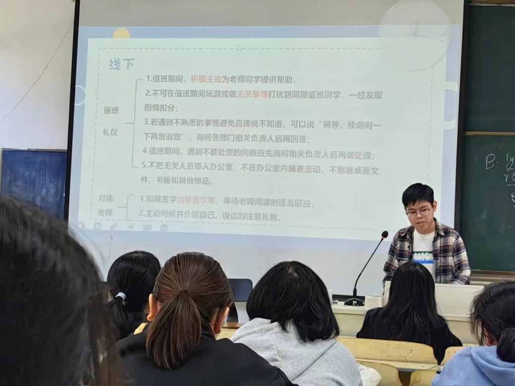学姐学长向青训营成员们提出了遵守纪律、树立好员工干部形象、组织好本部门相关活动的要求,旨在提高各干部干事的综合能力,确保各项工作的顺利进行。主持人还介绍了各部门的职能,让各部门青训营成员之间相互了解XCSport员工会所有部门的职能,便于各部门日后能更好地相互学习,协调合作。