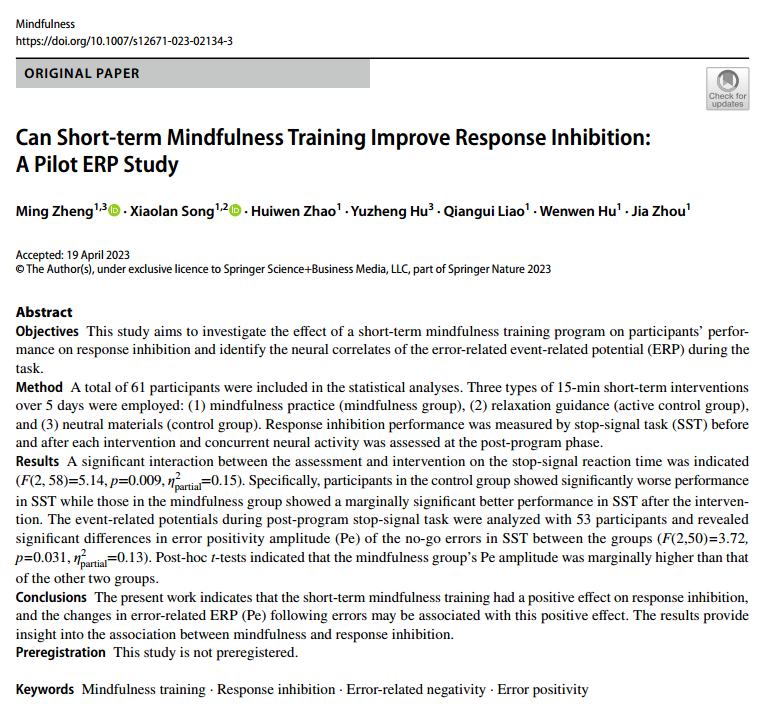 论文来源:Zheng, M., Song, X., Zhao, H., Hu, Y., Liao, Q., Hu, W., & Zhou, J. (2023). Can Short-term Mindfulness Training Improve Response Inhibition: A Pilot ERP Study. Mindfulness, 14(5), 1259–1270.