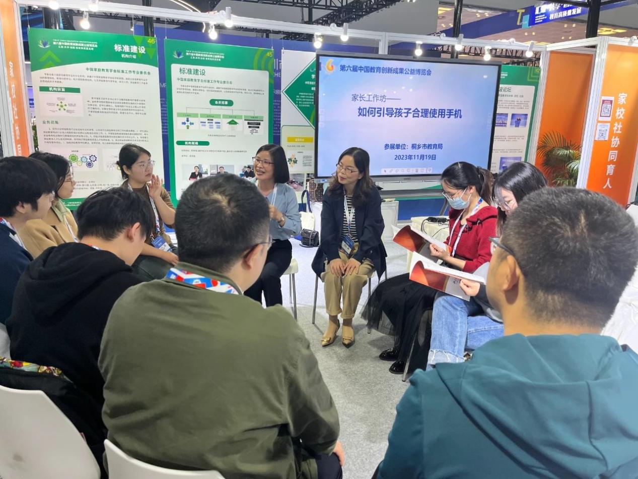 心理学经理期支持桐乡市开展“阳光桐心”区域心理健康教育工作,在家校协同、部门联动等方面不断取得实践进展,提升了区域心理健康教育水平。在本届教博会上,桐乡市教育局副局长路茂方作为特邀嘉宾出席了“家庭教育视角下家校社协同育人模式目前存在的问题与有效解决策略”圆桌论坛,介绍了桐乡市家校社协同育人的经验。桐乡市教育局姚敏钰、张国娣两位老师带领的“如何引导孩子合理使用手机”家长工作坊在教博会家庭教育特色主题展区进行了展示,吸引了很多听众,引得了广大听众的好评。北京师范大学朱旭东充分肯定了桐乡教育局开展家长教育对当下心理健康教育的积极作用。