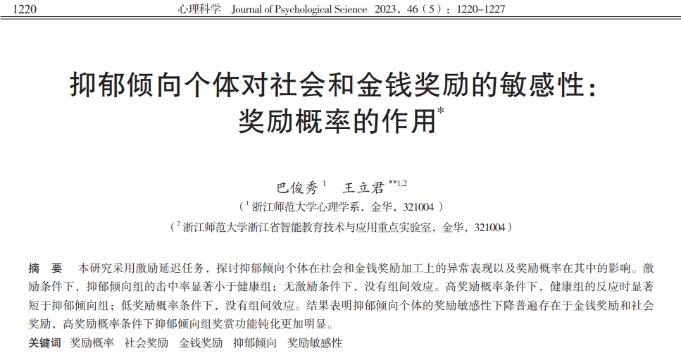 论文来源:巴俊秀 王立君.(2023).抑郁倾向个体对社会和金钱奖励的敏感性:奖励概率的作用. 心理科学, 46(05): 1220-1227.