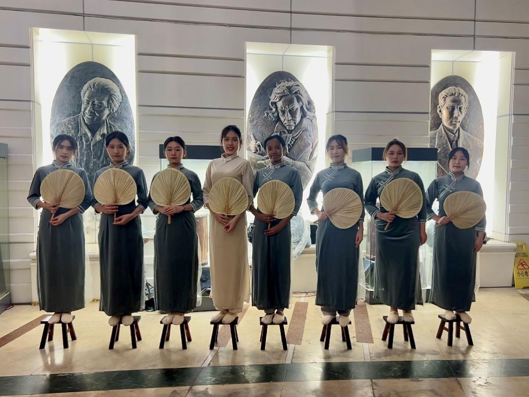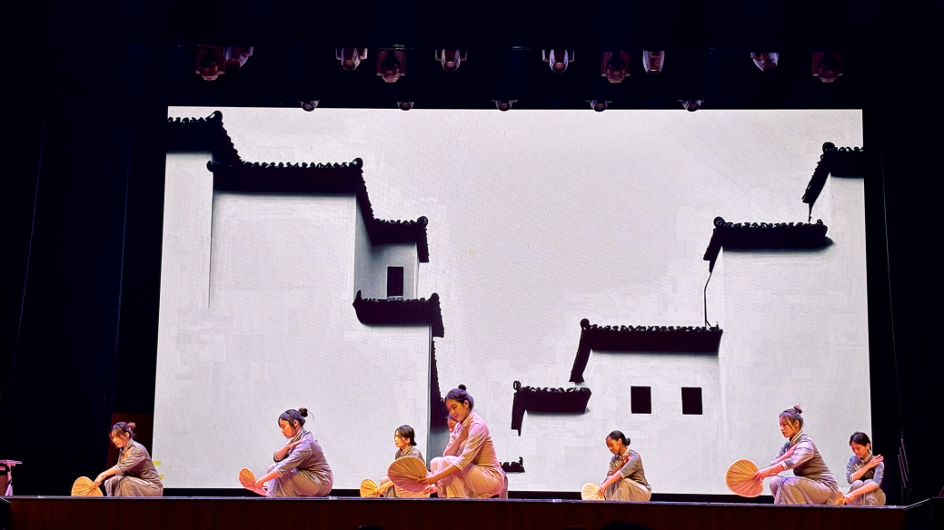 悠扬的音乐,预示着晨光初现,舞者们身着烟灰色旗袍,手持蒲扇,从微光中款款走来。轻摇蒲扇,面带微笑,眼神中充满着对未来的希望。服装素净淡雅,处处都体现着江南女子的温婉柔美。作品中洋溢着对新生活的美好憧憬,对新时代的期许渴盼,感染了在场的每一位观众。