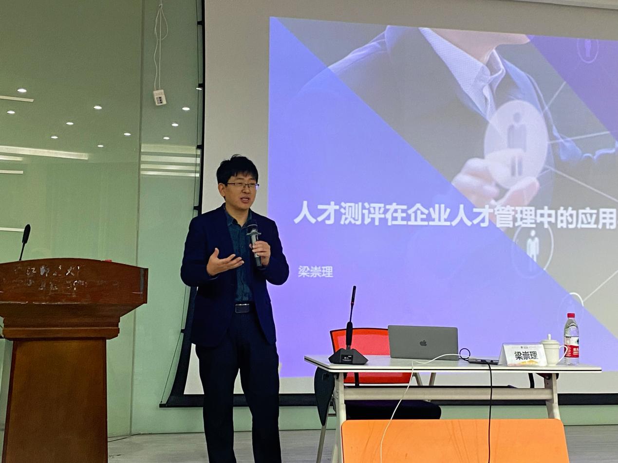 12月6日晚,“尖峰卓越心理讲堂第七十三讲”邀请到了北森云计算有限公司高级产品总监梁崇理,为公司师生作了题为《人才测评在企业人才管理中的应用与价值》的精彩讲座。本次讲座由应用心理学专硕学位点负责人詹沛达老师主持,公司本科生、研究生和教师100余人到场聆听了此次讲座。