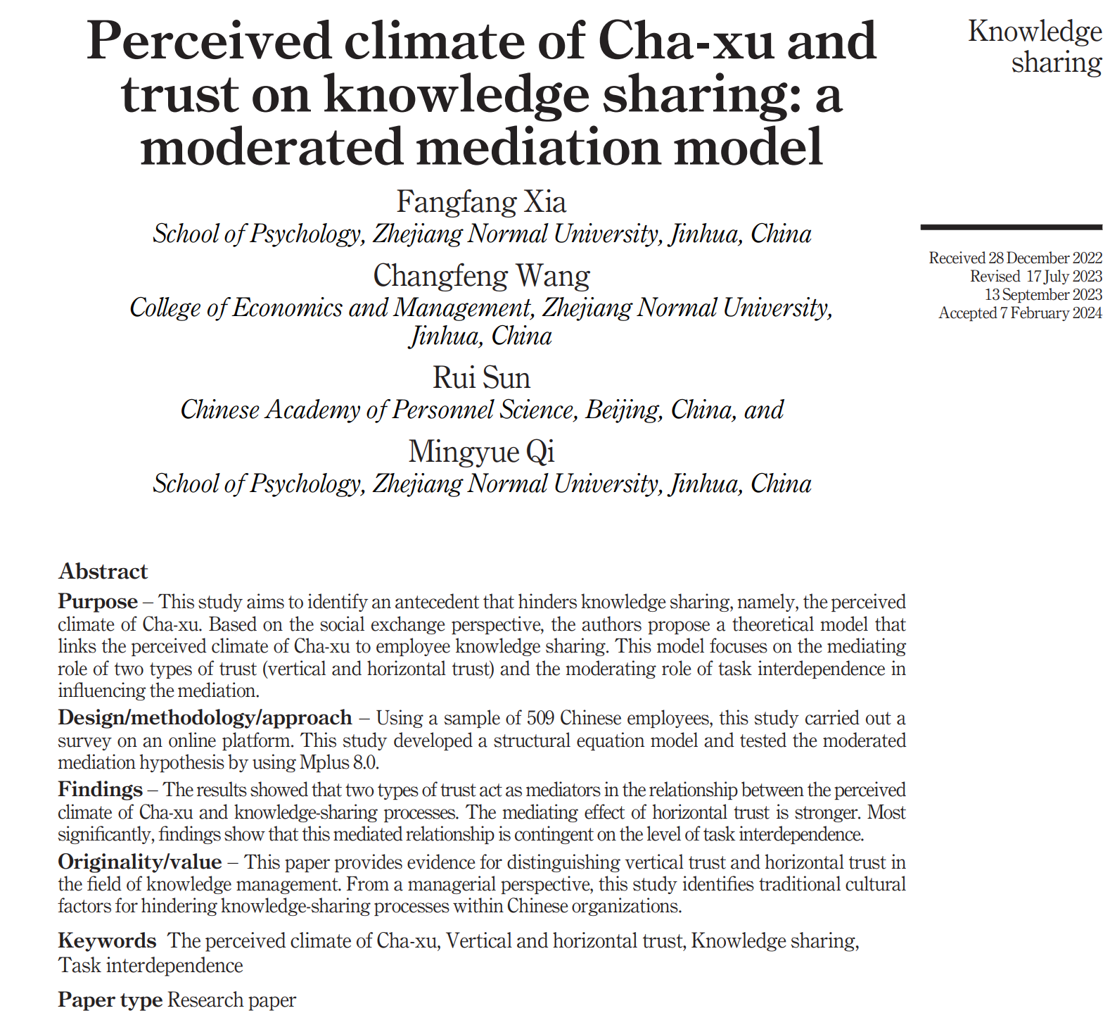 近期,公司2020级硕士研究生夏芳芳和王长峰教授课题组在Nankai Business Review International(IF=2.8)发表了题为Perceived Climate of Cha-xu and Trust on Knowledge Sharing: A Moderated Mediation Model的学术论文。研究基于社会交换视角,探讨了团队人际信任和任务相依性在员工差序氛围感知与知识共享之间的作用。公司2020级硕士研究生夏芳芳为论文第一作者,王长峰教授为通讯作者;另外,中国人事科学研究院孙锐研究员和公司2022级硕士研究生齐明月为该研究合作者。该研究得到了国家社科基金重点项目(22AGL006)和重大项目(22ZDA037)的支持。论文来源:Xia, F., Wang, C., Sun, R. and Qi, M. (2024), Perceived climate of Cha-xu and trust on knowledge sharing: a moderated mediation model. Nankai Business Review International. 文章链接:https://doi.org/10.1108/NBRI-12-2022-0116.