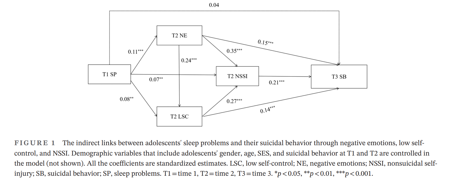 近年来,我国青少年**率持续攀升,青少年**行为已成为当今社会广泛关注的公共问题。睡眠问题是识别和预防青少年**行为的一个潜在危险因素,然而我们对二者之间的潜在机制尚不清晰,尤其是在前瞻性研究中。如何度过漫漫长夜,并在睡眠问题中预防青少年**行为呢?为回答这一问题,本研究以1214名青少年作为研究对象,采用为期一年的纵向追踪设计,探讨睡眠问题和青少年**行为之间的关系,并进一步验证这种关系是否受到负面情绪、低自我控制能力和非**性自伤的影响。结果发现,高水平睡眠问题会直接增加青少年**行为风险,并且还能通过多种间接途径对**行为起作用——青少年睡眠问题可能加剧负面情绪、削弱自我控制并促进非**性自伤,因而导致**行为增加。研究结果这启示我们,在青少年**预防和干预工作中可以考虑将睡眠问题作为一个潜在识别与预防因素,对减少青少年**行为具有重要意义。