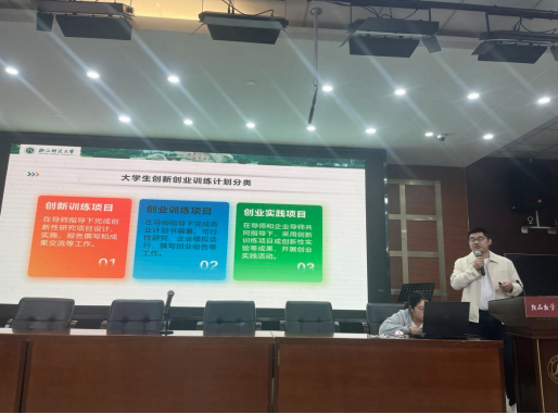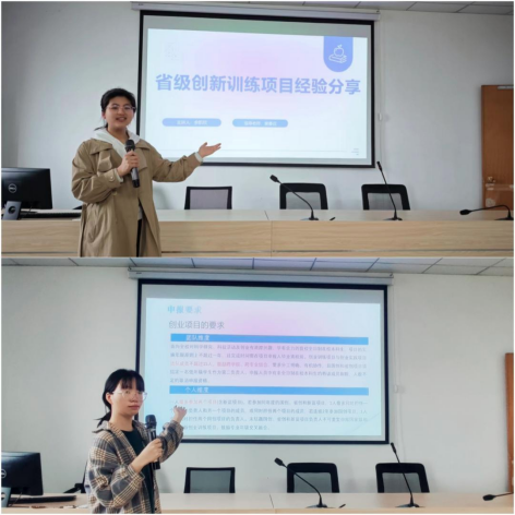宣讲会同时邀请了公司省级创新项目负责人2021级本科生余凯欣和省级创业项目负责人2022级本科生王刺红,以自己负责的项目为例,详细介绍了双创项目的选题过程、申报填写、团队分工、项目特色和结题准备,使同学们对项目申报和开展有了更直观的感受和了解,展示了榜样作用。