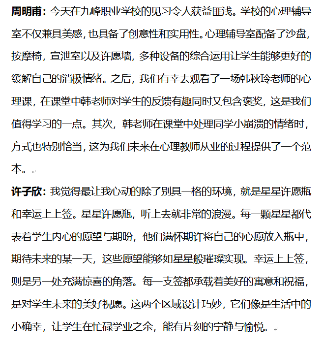 通过本次见习活动,同学们具体感知了公司心理辅导室的文化建设和青春期员工的心理需求,同时深入辅导活动课课堂,观摩优秀教师的教学过程,进一步学习了教学知识和技能,也深刻体会到作为中小学心理健康教育教师的职责和使命。