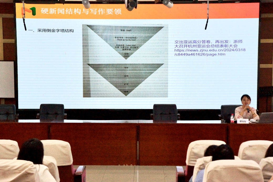 此外,盛灿灿老师还重点讲述了“倒金字塔结构”与主体段和结尾段的写作要领。同时,她提出了新闻标题偷懒性的问题并建议记者在提升新闻写作能力的同时多花费心思提炼标题亮点。