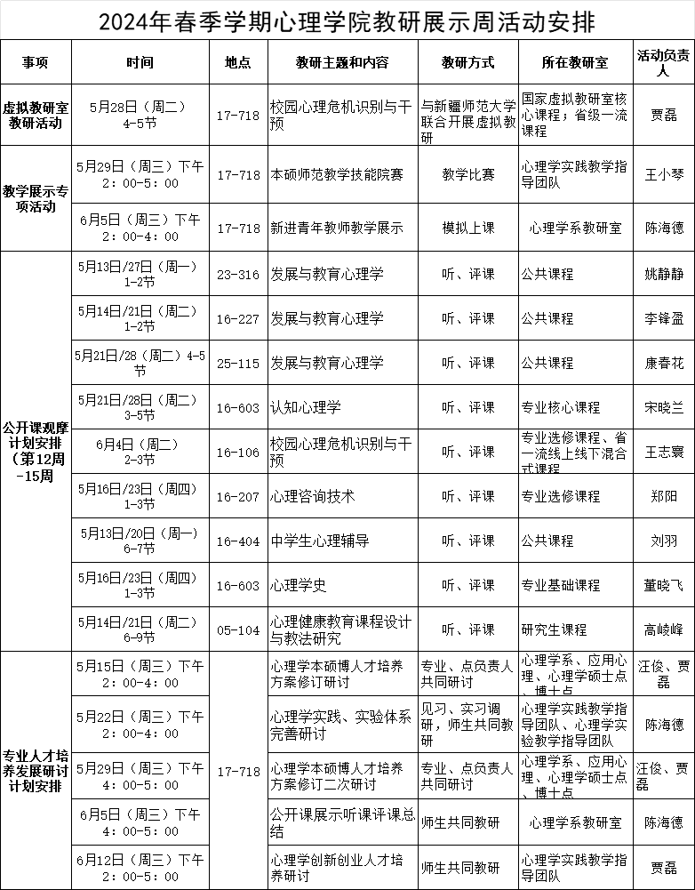 为进一步推动人才培养质量提升,营造积极浓郁的教研氛围,提升教研能力和教学水平,公司拟于5月13日至6月12日开展春季学期教研展示周系列活动。具体安排如下: