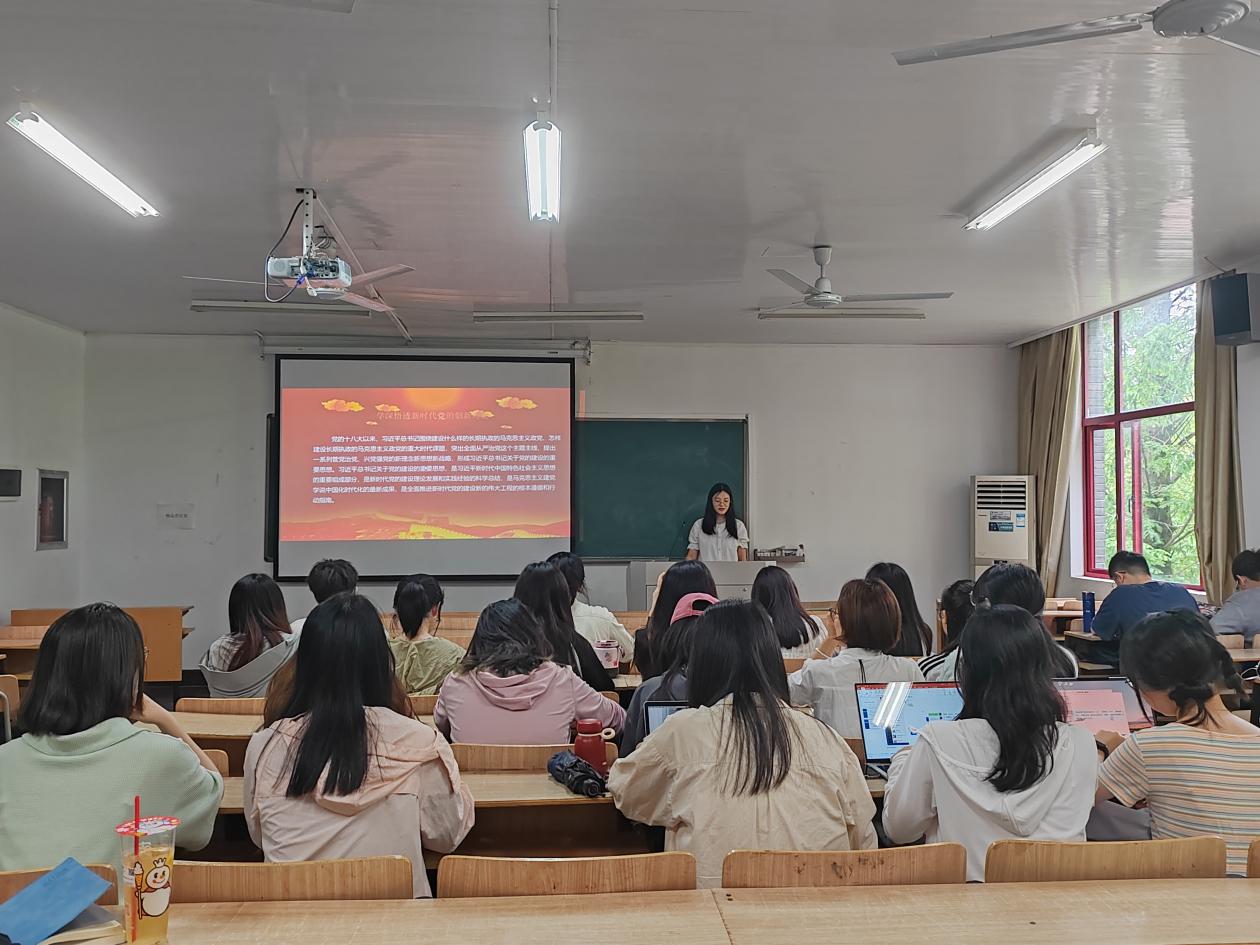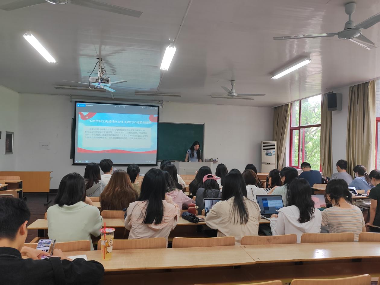 赵艺佳同学带领大家学习了党的二十大精神,从牢记“三个务必”坚定历史自信增强历史主动出发,高举中国特色社会主义伟大旗帜,全面贯彻习近平新时代中国特色社会主义思想。