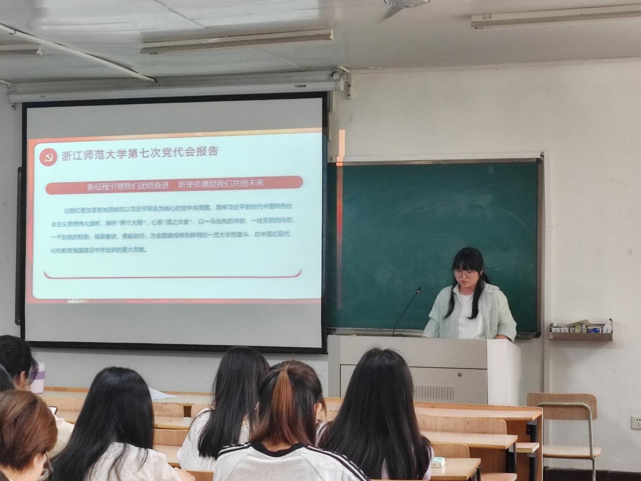 唐心怡同学以XC体育第七次党代会精神为题,从浙师新成就、浙师新愿景、浙师新篇章、浙师新局面四方面展开汇报分享,并表示新征程引领我们团结奋进,新使命激励我们共创未来。