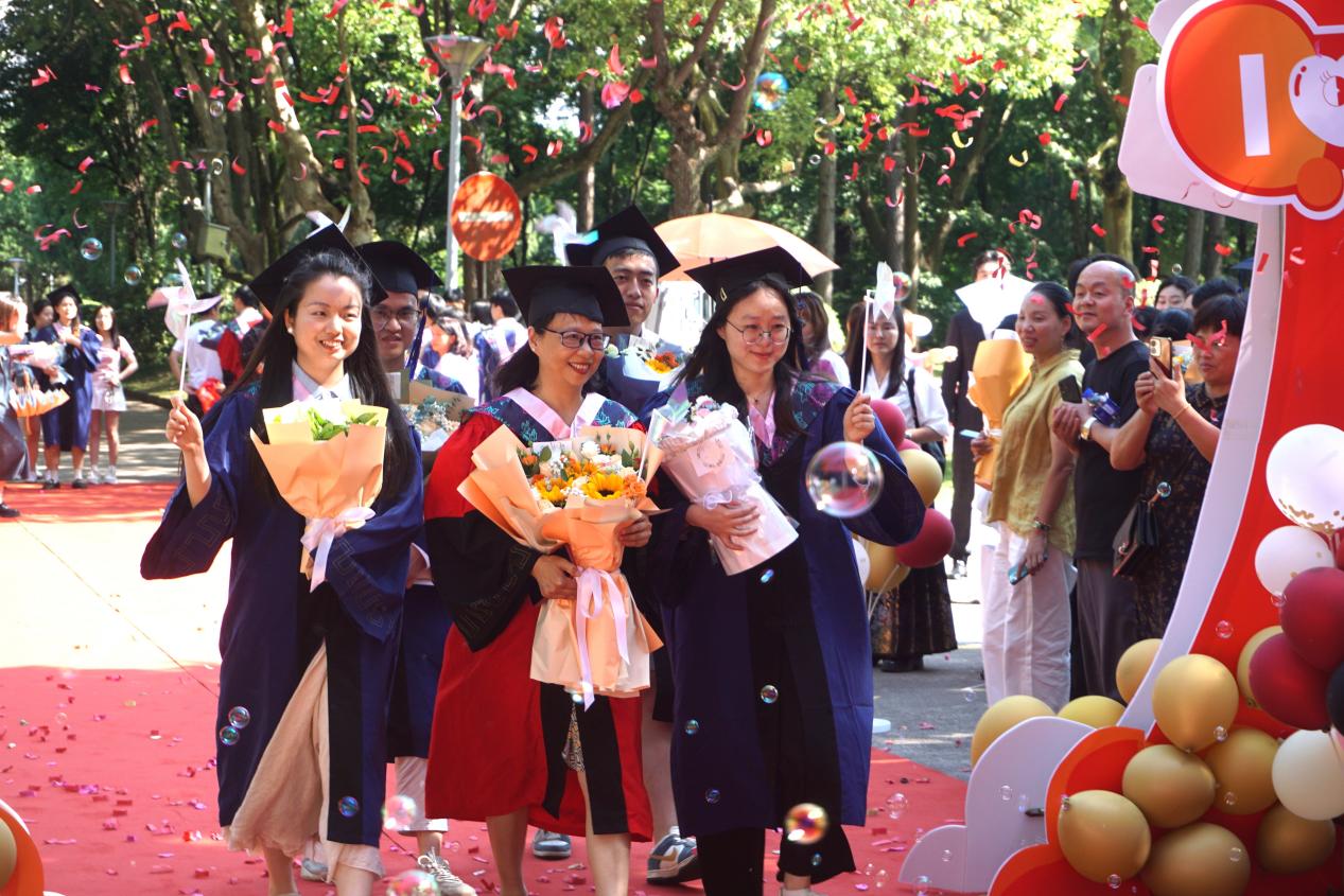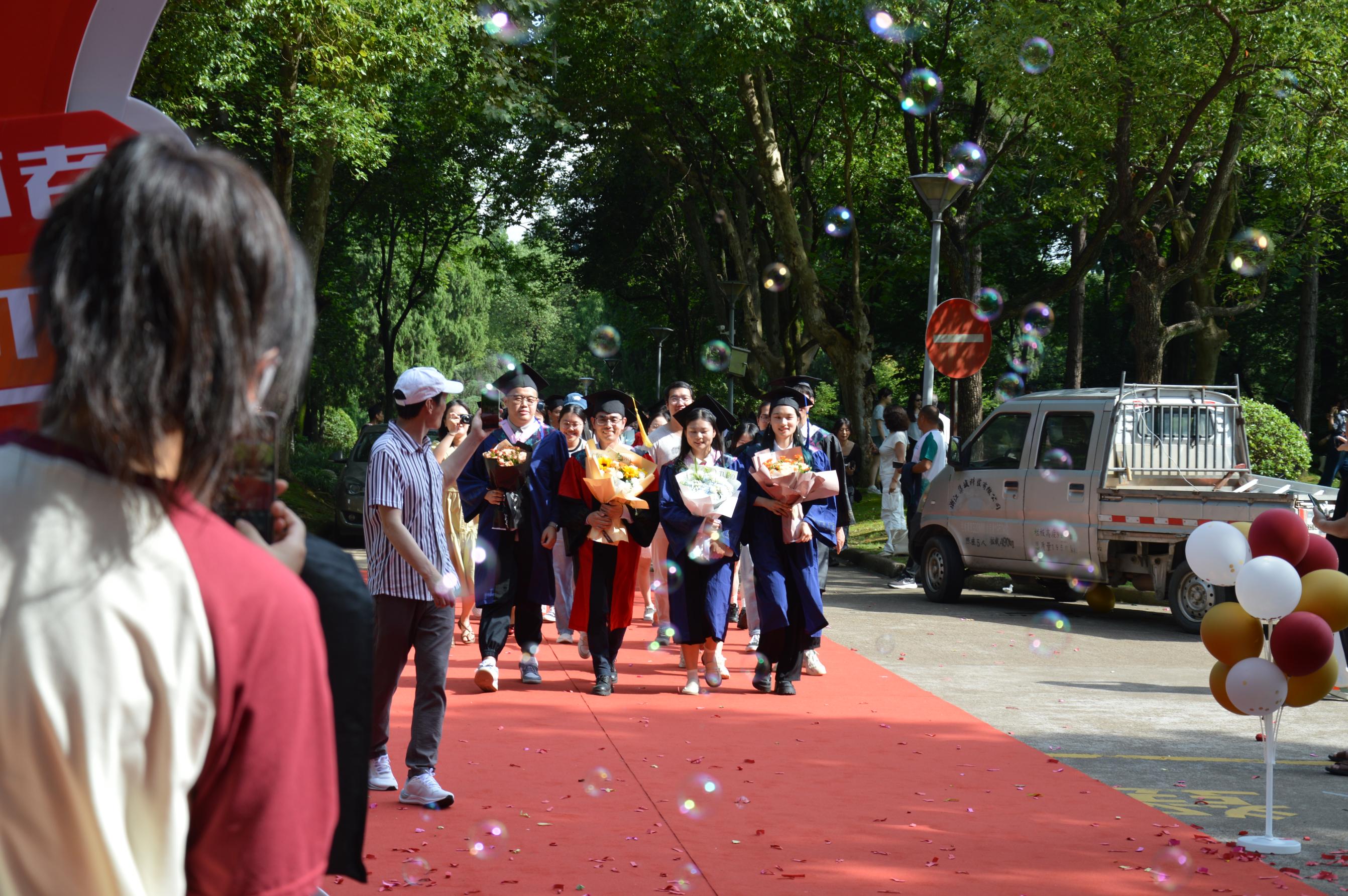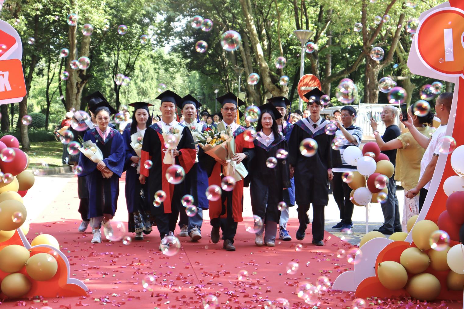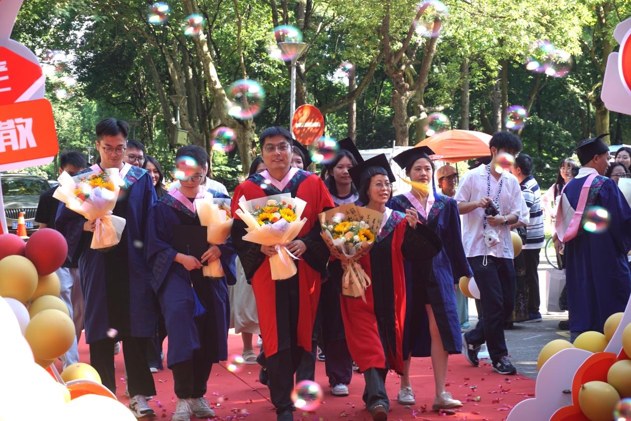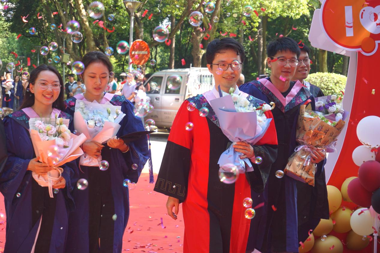 阳光下飞舞着泡沫与彩带,红毯上绽放着五彩的青春、印刻着奋进的足迹。典礼开始前,2024届毕业生在导师、班主任的带领下走上红毯,迎接鲜花与礼炮,携手走向未来。