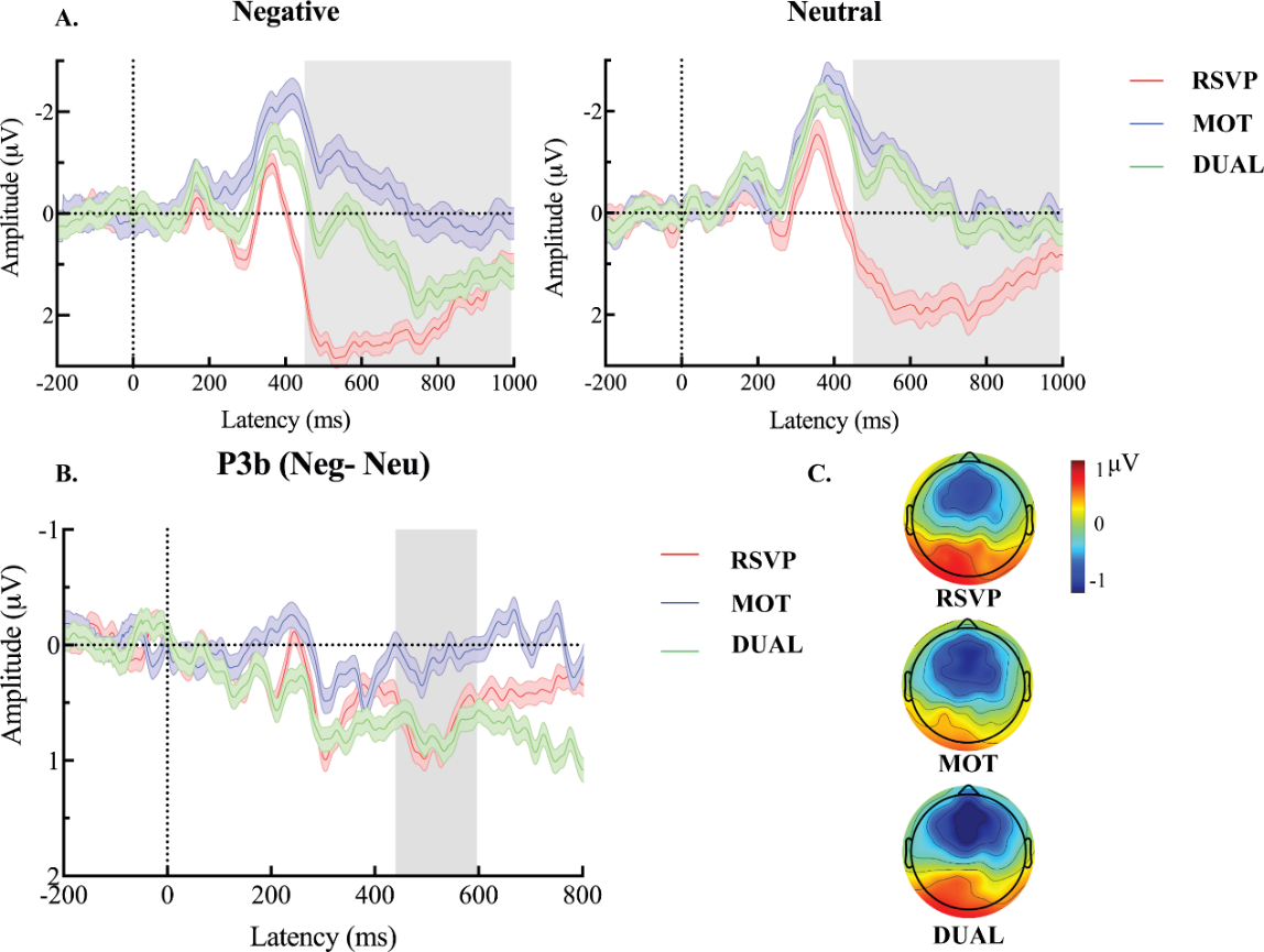 EEG和MEG的结果进一步证明这一观点。事件相关电位(ERP)分析发现负性图片在在N2/EPN时间窗和P3b时间窗均引起了更大的振幅,但在MOT任务中,负性与中性的差异不显著,这可能表明在高认知负荷下,注意系统能够更有效地抑制情感干扰物。