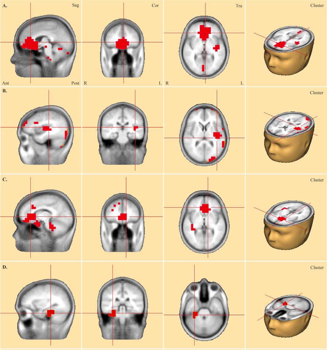 图3 A.负性图片,EPN时间窗(276-390毫秒),前扣带回皮层,BA32;B.负性图片,P3B时间窗(440-469毫秒),左侧脑岛,BA 22,41;C.负性图片,P3B时间窗(470-490毫秒),扣带回皮质,BA 24;D.中性图片,P3B时间窗(548-566毫秒),右侧旁海马回,BA 35,36。